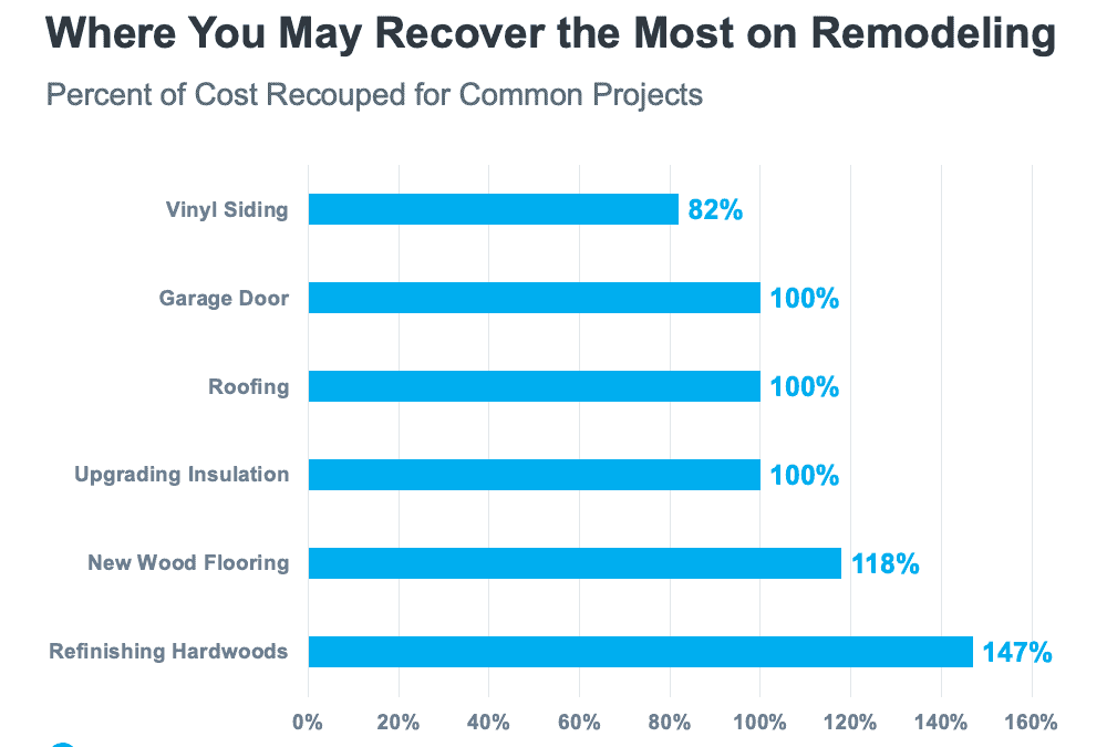 In addition to making sure your house makes a good first impression, you’ll also want to consider the return on your investment (ROI) for any renovations. According to the 2022 Remodeling Impact Report from the National Association of Realtors (NAR), here are the projects that could net you the best return when you sell your house (see visual below):