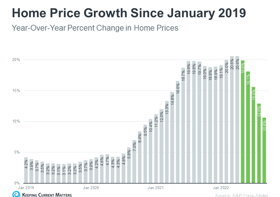 While home prices are down slightly month-over-month in some markets, it’s also true that home values are up nationally on a year-over-year basis. The graph below uses the latest data from S&P Case-Shiller to help tell the story of what’s actually happening in the housing market today: